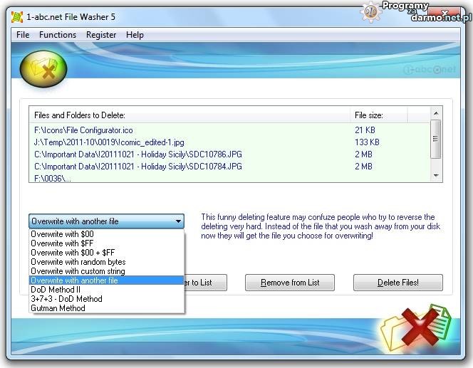 1-abc.net File Washer usunie pliki bezpiecznie dzięki 9 różnym metodom bezpiecznego usuwania.Usuniętych za pomocą tego programu danych nie będzie można odzyskać nawet za pomocą specjalistycznego oprogramowania.