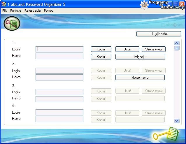 1-abc.net Password Organizer posiada także wbudowany generator losowych silnych haseł, działający według zadanego klucza.Interfejs programu jest w języku Polskim.