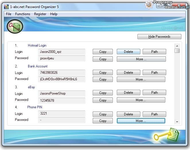 1-abc.net Password Organizer to prosta w obsłudze aplikacja przeznaczona do przechowywania loginów i haseł w jednym miejscu. Do każdego wpisu można przyporządkować stronę odpowiednią stronę WWW oraz dodać dodatkowe informacje.