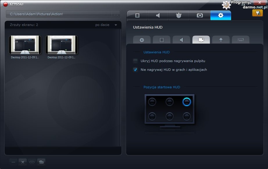 Na tej karcie znajdują się ustawienia HUD (Toolbar). Możemy go nie nagrywać w grach i aplikacjach, ukryć HUD podczas nagrywania pulpitu oraz wybrać jego pozycje startową. Zmiany będą widoczne po restarcie Action!.