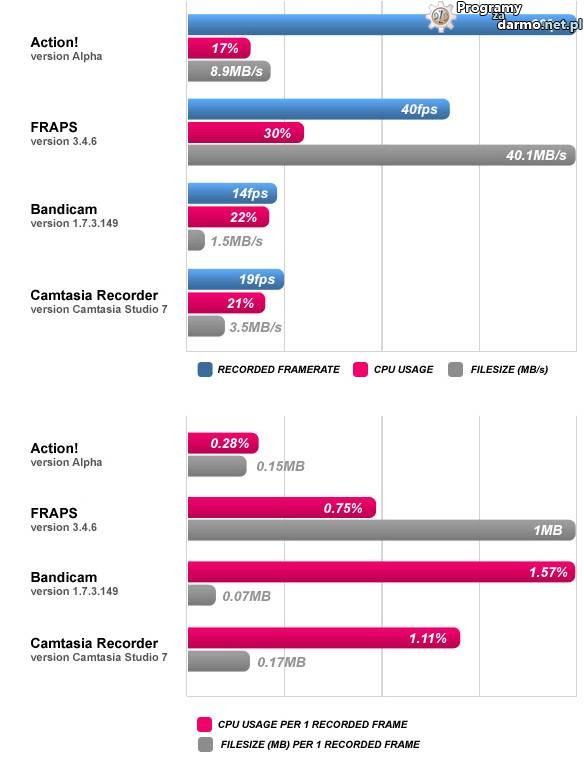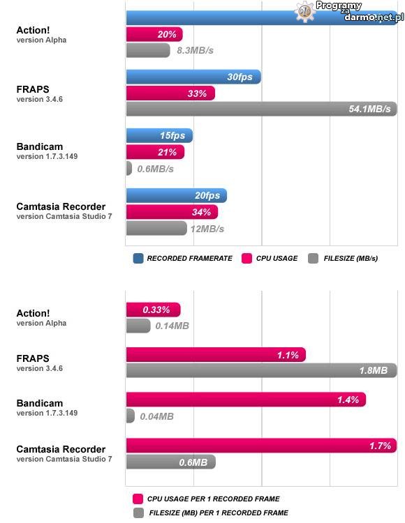 Producent przeprowadził testy wydajności programu Action! ( wersja Alpha ) vs inne programy tego typu : Fraps, Bandicam i Camatasia Recorder.