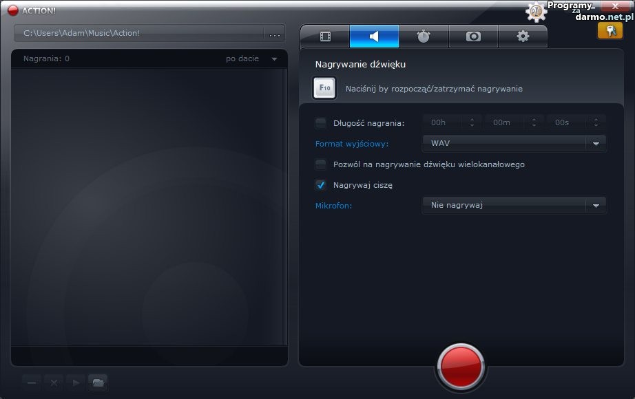 Na tej zakładce możemy nagrać sam dźwięk oraz ustawić : Długość nagrania, Format wyjściowy (WAV, MP4 Audio), Mikrofon (Nie nagrywaj, Zawsze nagrywaj, Nagrywaj na przycisk), nagrywanie ciszy i nagrywanie dźwięku wielokanałowego.Podgląd nagrań audio mamy w lewym okienku.