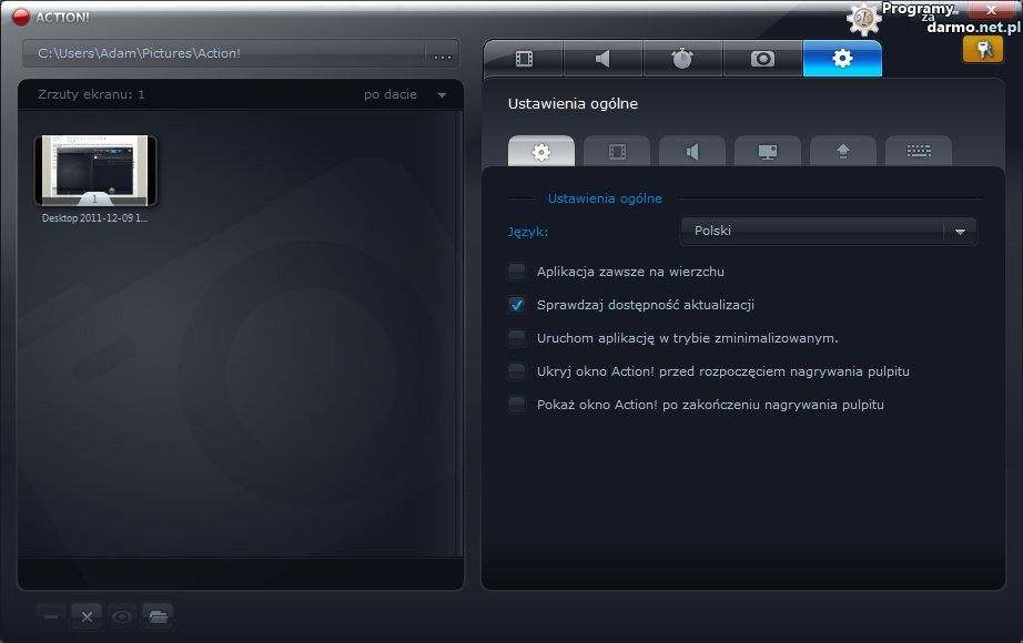 Tutaj możemy zmienić język programu, a także ustawić opcje: Aplikacja zawsze na wierzchu, Sprawdzaj dostępność aktualizacji, Uruchom aplikację w trybie zminimalizowanym, Ukryj okno Action! przed rozpoczęciem nagrywania pulpitu, Pokaż okno Action! po zakończeniu nagrywania pulpitu.