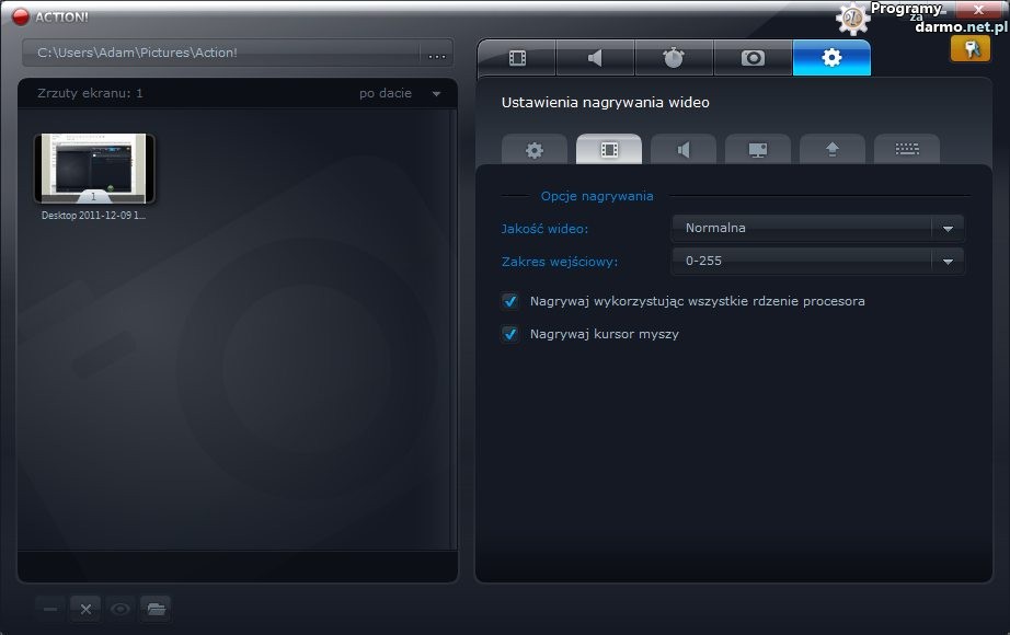 Na tej karcie możemy ustawić opcje nagrywania wideo, takie jak jakość wideo (Niska, Normalna), czy zakres wejściowy (0-255, 16-235). Możemy także ustawić nagrywanie kursora myszy, oraz wybrać czy podczas nagrywania mają być wykorzystywane wszystkie rdzenie procesora.
