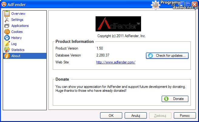 AdFender może także blokować reklamy w aplikacjach typu P2P i IM (komunikatory internetowe). Jest często aktualizowany i łatwy w obsłudze, po instalacji jest gotowy do pracy i nie wymaga dodatkowej konfiguracji ze strony użytkownika, jedyne co należy zrobić to otworzyć okno programu, przejść do About i kliknąć Check for updates aby program pobrał najnowsze aktualizacje.