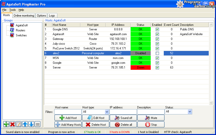 AgataSoft PingMaster Pro – to narzędzie do diagnozowania i monitorowania sieci.Program przeznaczony jest do monitorowania dostępności hostów podłączonych do sieci LAN lub Internetu (komputery, serwery, routery, przełączniki), i ostrzegania administratorów w przypadku awarii.