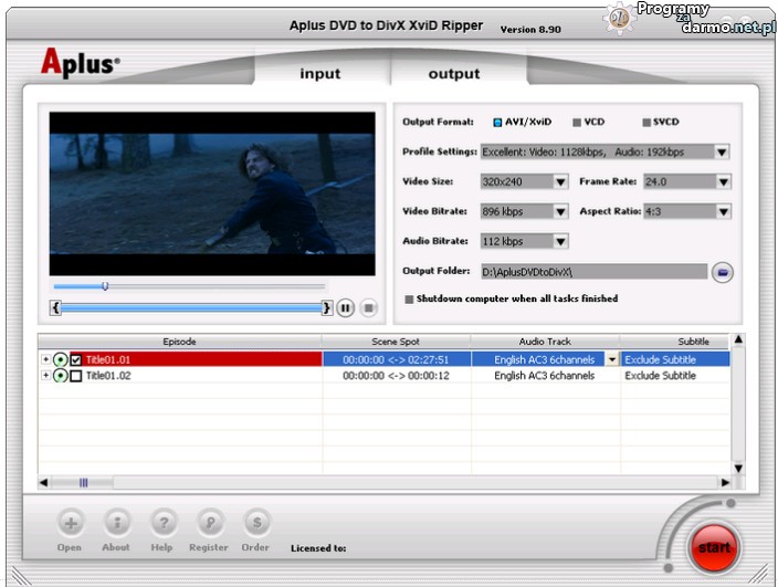 Aplus DVD DivX XviD Ripper posiada wbudowany odtwarzacz, w którym zaznaczysz fragment do konwersji i uzyskasz jego podgląd oraz sekcję z ustawieniami pliku wynikowego, pozwala także ustawić jakość obrazu, dźwięku, wybrać rozdziały do konwersji, ścieżki audio i listy dialogowe.