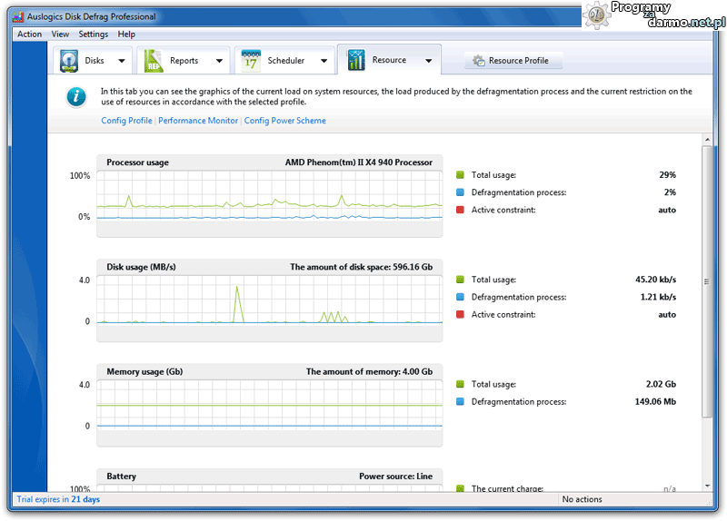 Zarządzanie zużyciem zasobów systemowych przez program pozwala na skuteczną defragmentację nawet podczas wykonywania codziennych czynności na komputerze.