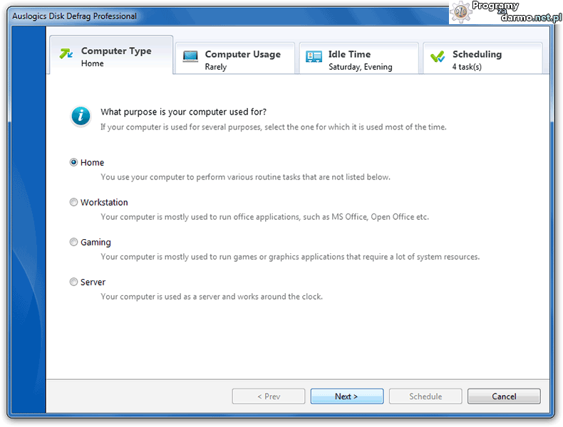 Przy tak wielu algorytmach optymalizacji dysków i dostępnych opcjach mało doświadczony użytkownik zapewne nie za bardzo wie co wybrać dla swojego komputera. Dzięki kreatorowi defragmentacji, to kwestia zaledwie kilku prostych kliknięć. Wszystko co musisz zrobić to podać w jaki sposób głównie używasz komputera (dom, biuro, gry lub jako serwer), jak często pracujesz z różnymi rodzajami dokumentów itp. Te informacje pomogą zasugerować użytkownikowi najbardziej odpowiedni algorytm optymalizacji i defragmentacji, w celu osiągnięcia najlepszej wydajności dysku i systemu.