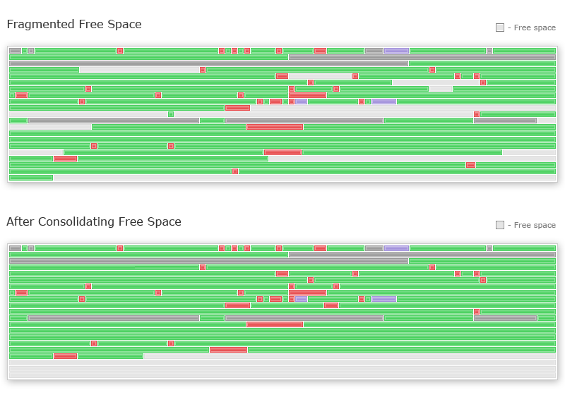 Konsolidacja ma za zadanie znacznie spowolnić proces fragmentacji plików. Ta metoda optymalizacji łączy wolne miejsca na dysku do tzw. dużego bloku ciągłego, dzięki czemu wszystkie nowe pliki zostaną zapisane bez fragmentacji.Podczas konsolidacji wolnego miejsca, program również defragmentuje pliki więc cały proces może potrwać dłużej, oczywiście możemy wyłączyć defragmentację podczas konsolidacji.