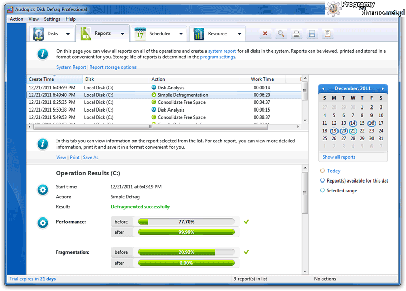 Auslogics Disk Defrag PRO wyświetla bardzo szczegółowe raporty dotyczące wykonanych wcześniej operacji. Możemy zobaczyć stopień fragmentacji plików i wolnej przestrzeni, rozmiar największego ciągłego bloku wolnego miejsca na dysku oraz ilość plików przetwarzanych podczas każdej operacji. Można także śledzić ogólny stan dysku i jego wydajność poprzez graficzne wykresy. Wszystkie raporty mogą być przeglądane, drukowane i przechowywane w bardzo wygodnej formie.