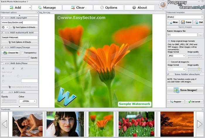 Wystarczy wybrać zdjęcia które chcemy oznakować, ustawić opcje znaku wodnego i gotowe. W program wbudowano kilka użytecznych funkcji, takich jak szablony znaków wodnych, konwersja i kompresja obrazu. Program posiada interfejs w języku angielskim.
