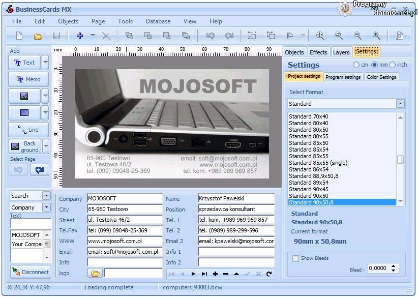 Cechy programu do projektowania wizytówek BusinessCards MX: