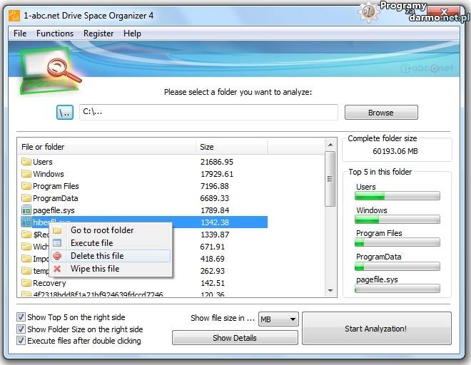 1-abc.net Drive Space Organizer to program który wyszukuje/analizuje dyski twarde i inne nośniki danych i wyświetla szczegółowe informacje o plikach/folderach które zajmują najwięcej miejsca pozostawiając wybór czy takie pliki/foldery należy usunąć czy też nie. Wyniki analizy ukazane są w postaci listy posegregowanej od największego rozmiaru do najmniejszego, dowolne pliki/foldery na liście możemy skasować dzięki czemu będziemy mieli więcej miejsca na dysku.