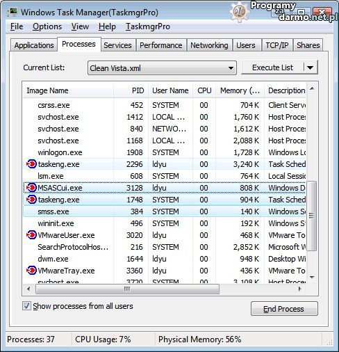 TaskmgrPro – to program (instalowany jako wtyczka) który rozbudowuje możliwości Menedżera Zadań wbudowanego w systemy Windows, dodając cztery dodatkowe karty ( Processes – Procesy, Services – Usługi, Startup – Uruchamianie, Shutdown – Zamykanie)