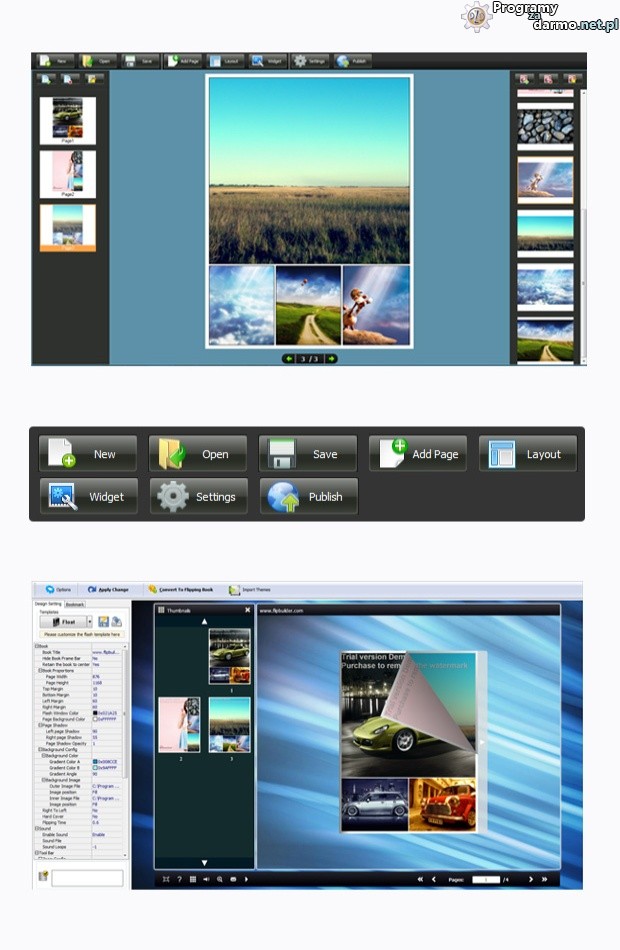 Photo to FlipBook – to aplikacja za pomocą której w prosty sposób utworzysz wspaniałe albumy ze zdjęciami. Z Photo Flipbook, możesz stworzyć fajne albumy ze zdjęciami w mniej niż 5 minut w technologii flash.Wystarczy tylko zaimportować zdjęcia, a następnie wybrać motyw (szablon) i gotowe.