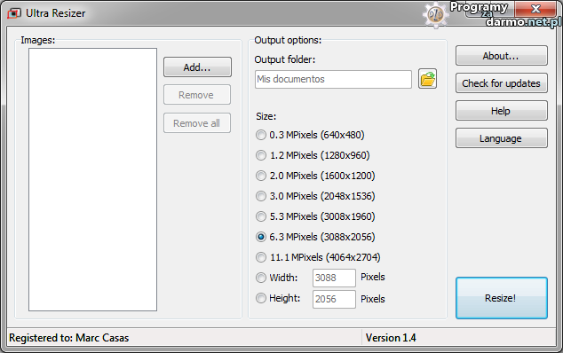 Ultra Resizer jest prostą w obsłudze aplikacją która pozwala na szybką zmianę rozmiaru zdjęć.Program obsługuje między innymi takie formaty jak JPEG, BMP i PNG. Ultra Resizer jest szybki i bardzo prosty w obsłudze. Wystarczy wybrać zdjęcia których rozmiar chcesz zmienić, wybrać folder wyjściowy oraz żądany rozmiar wyjściowy i kliknąć przycisk Resize.