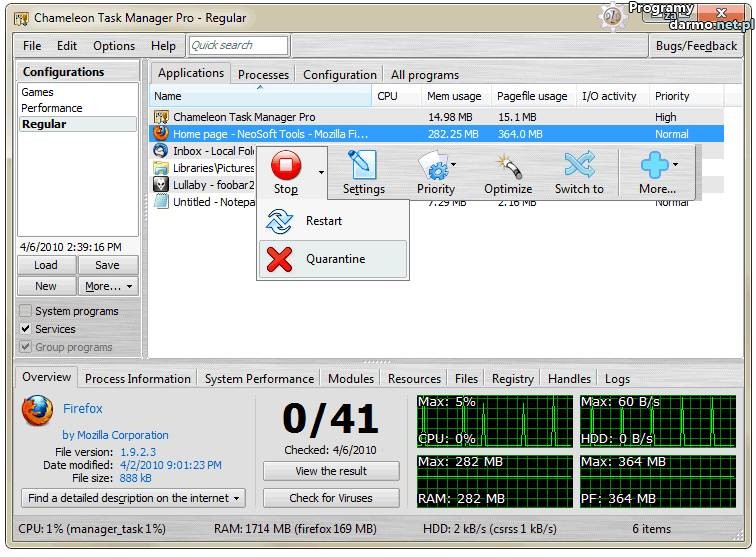 Chameleon Task Manager jest zamiennikiem dla menedżera zadań wbudowanego w system Windows.Chameleon Task Manager umożliwia pełną kontrolę procesów uruchomionych na komputerze, oraz optymalizację wydajności systemu Windows. Wyświetla on także bardzo szczegółowe informacje na temat uruchomionych w systemie programów/procesów.