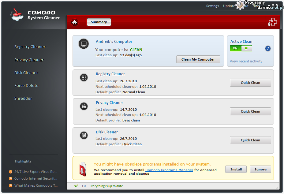 COMODO System Cleaner – to darmowy i bardzo rozbudowany pakiet programów przeznaczony do optymalizacji i oczyszczania systemu Windows.W skład pakietu wchodzą :