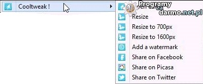 Cooltweak – to bezpłatna aplikacja która pozwala szybko i łatwo zmieniać rozmiar zdjęć, dodać znak wodny a nawet dzielić się zdjęciami na popularnych serwisach takich jak Facebook, Picassa i Twitter bezpośrednio z poziomu menu kontekstowego (PPM).