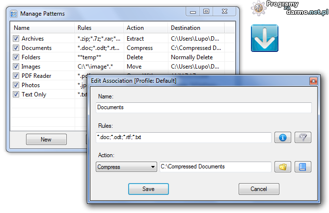 DropIt – to bezpłatne narzędzie służące do automatycznego sortowania oraz wypełniania plików i folderów.Program pozwala na skonfigurowanie 9 typów akcji dla plików i folderów (przenieś, kopiuj, kompresuj, rozpakuj, Zmień nazwę, Otwórz za pomocą, Lista , Usuń i Ignoruj), filtrowanie plików według nazwy, daty, rozszerzenia, lokalizacji oraz rozmiaru.Wszystkie te działania mogą być wykonywane automatycznie co pozwoli nam zaoszczędzić dużo czasu 😀 .DropIt pozwala także utworzyć profile akcji i powiązać je z wybranymi folderami które będą monitorowane w określonych odstępach czasu.Dodatkowo program obsługuję funkcję przeciągnij i upuść 😀