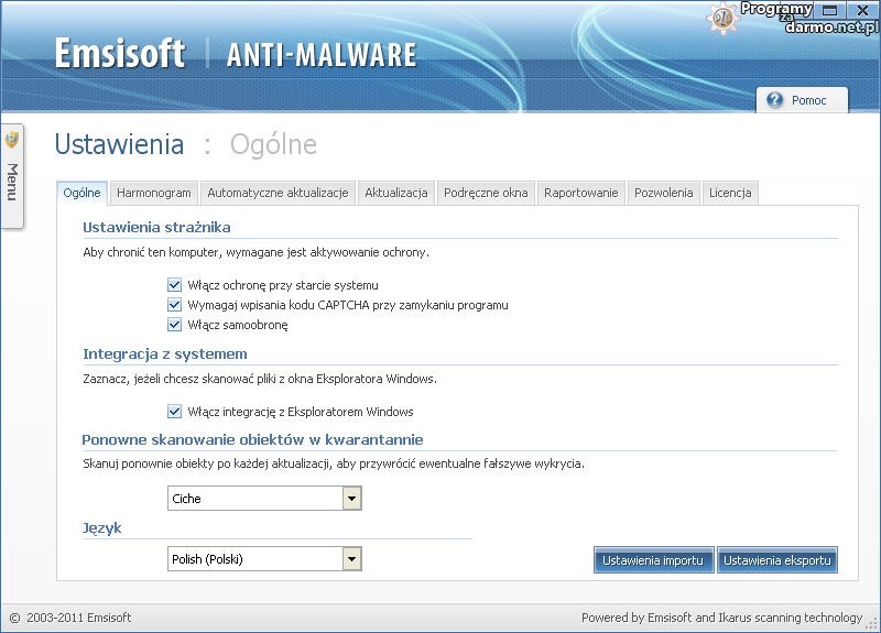 Sama konfiguracja programu nie sprawi nam dużego problemu, poza ogólnymi ustawieniami możemy też zaplanować skanowanie za pomocą harmonogramu, ustawić aktualizacje automatyczne, czy też wyskakujące powiadomienia.
