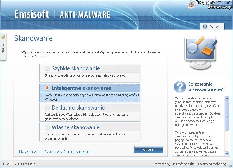 - Inteligentny – Skanuje to samo co szybki oraz dodatkowo foldery systemowe.