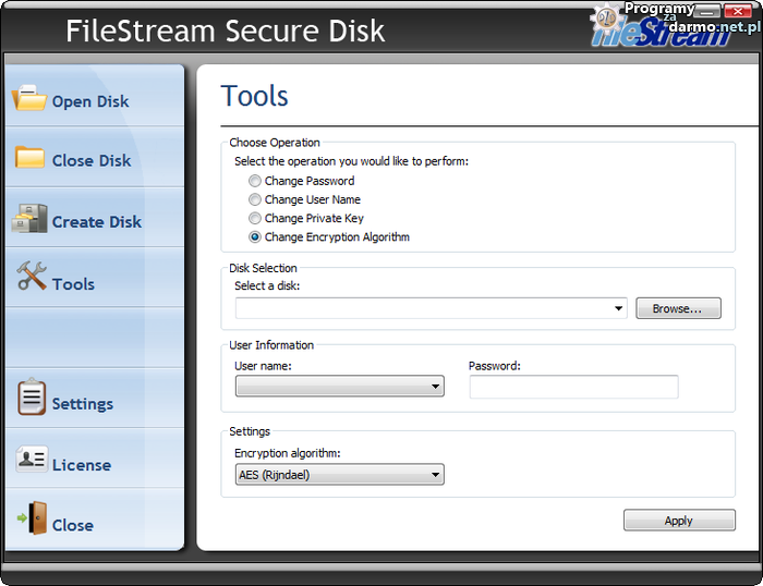 FileStream Secure Disk – jest doskonałym rozwiązaniem dla ochrony ważnych prywatnych informacji przed kradzieżą lub nie autoryzowanym dostępem.Program umożliwia zabezpieczenie części lub całość dysku twardego, pamięci flash USB czy dysku wymiennego, do którego będzie możliwy dostęp tylko po zalogowaniu określonego użytkownika i po podaniu hasła.