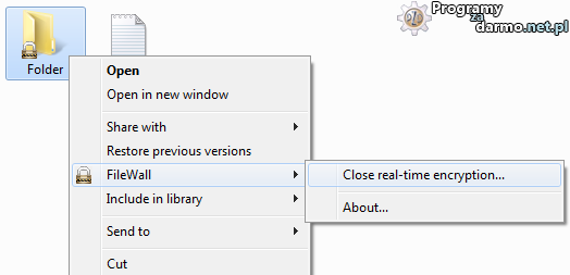 Jak już pisałem wcześniej, FileWall oferuje funkcję o nazwie Real-Time Encryption czyli szyfrowanie w czasie rzeczywistym/ lub w tzw.locie. Po kliknięciu prawym przyciskiem myszy na folder, wybieramy opcję Open real-time encryption i wprowadzamy hasło, od teraz wszystkie dane ( nowo dodawane i te które już tam są ) będą automatycznie szyfrowane, co jest bardzo przydatnym i wygodnym rozwiązaniem. Gdy skończymy wprowadzać dane do tego folderu, klikamy prawym przyciskiem myszy na folder i wybieramy opcję Close real-time encryption.