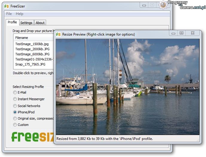 FreeSizer – jest bezpłatnym narzędziem przeznaczonym do szybkiej zmiany rozmiaru zdjęć.Program pozwala na zmianę wielu zdjęć jednocześnie i dzięki zastosowaniu funkcji Drag & Drop (przeciągnij i upuść) program jest bardzo prosty w obsłudze.