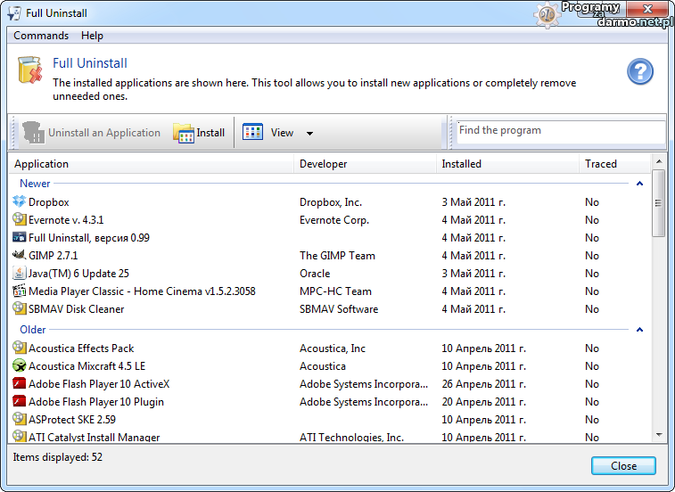Full Uninstall jest aplikacją która pomoże nam odinstalować całkowicie niepotrzebne już programy z naszego komputera i usunąć wszelkie ślady przez niego pozostawione. Są to między innymi wpisy w rejestrze, zbędne foldery lub pliki.Program świetnie nadaje się jako zamiennik systemowego Dodaj & Usuń programy.