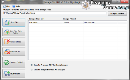 Image To PDF – to program przeznaczony do konwersji plików graficznych do plików w formacie PDF.Aplikacja obsługuje takie formaty jak JPG, BMP, PNG, TIF, GIF, EXIF, JPEG.Obsługa programu jest bardzo prosta, wystarczy wskazać pliki które chcemy przekonwertować i kliknąć przycisk Convert, oprogramowanie będzie bezpośrednio konwertować je do dokumentu PDF.