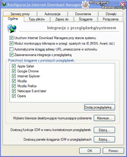Na karcie Ogólne można zmienić opcje integracji systemu IDM: automatyczne uruchamianie, opcje integracji przeglądarki, monitorowanie schowka. IDM integruje się domyślnie z Internet Explorer, Opera, Mozilla, Netscape i wiele innych popularnych przeglądarek.