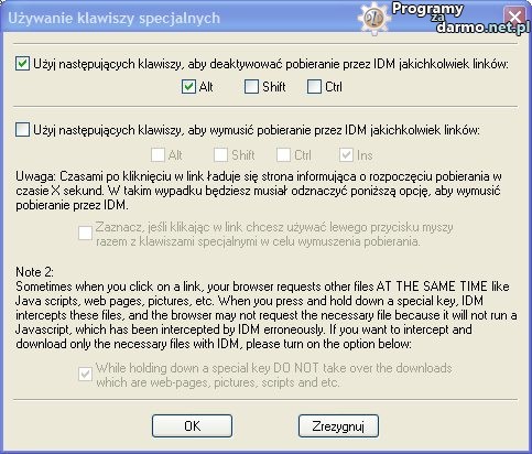 Klawisze umożliwiają wybór różnych klawiszy które zapobiegają lub wymuszają pobieranie z IDM. Po naciśnięciu na przycisk Klawisze, pojawi się okno dialogowe „Używanie klawiszy specjalnych”. Możesz wybrać połączenie jednego lub więcej klawiszy. Jeśli chcesz zapobiec lub wymusić pobieranie z IDM, naciskając klawisze specjalne, należy użyć „Zaawansowana integracja przeglądarki”.