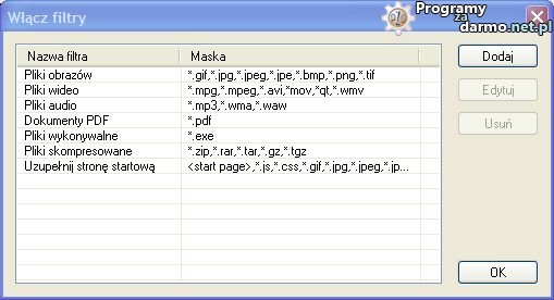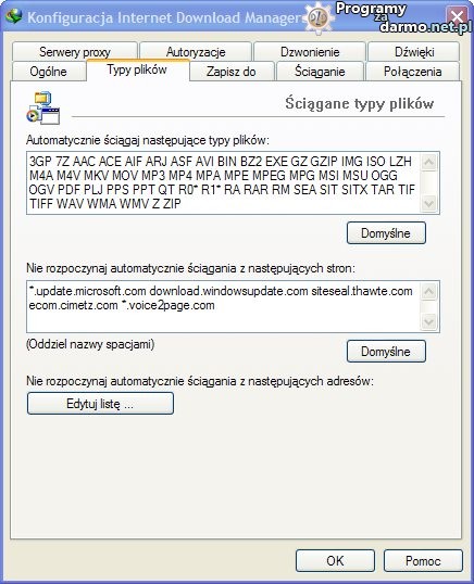 Na karcie Typy plików można zmienić listę typów plików, które będzie pobierała przeglądarka i nie będą pobierane przez IDM.