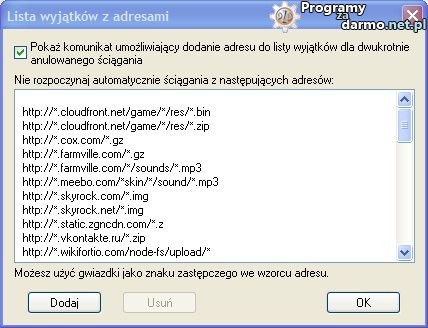 Możesz wykluczyć pobieranie plików przez IDM z określonych witryn. Jeśli nie chcesz aby IDM pobierał z danej witryny, możesz dodać adres strony do specjalnej listy Nie rozpoczynaj automatycznie ściągania z stron:”. Możesz użyć gwiazdki aby dopasować dowolną liczbę znaków. Na przykład jeśli wpiszesz *.tonec.com, to pliki nie będą pobierane przez IDM z ftp.tonec.com, http://www.tonec.com, http://www.games.tonec.com, itp.