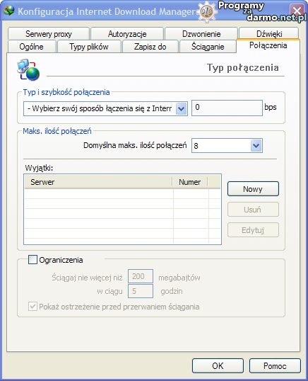 W zakładce Połączenia należy wybrać szybkość połączenia z Internetem. Jest to niezbędne dla optymalnego wykorzystania szerokości pasma. Staraj się unikać ustawiania „Liczba połączeń maksymalnych” do wartości większej niż cztery. Duża liczba połączeń (segmentów pliku) może pogorszyć wydajność transferu plików i może spowodować wzrost zużycia zasobów na serwerze, z pobraniem. Może to prowadzić do pewnych granic lub innych środków ochronnych od lokalnych administratorów systemu. Z drugiej strony, większa liczba połączeń może zwiększyć prędkość w bardzo istotny sposób, jeśli masz modem kablowy lub bardzo wykorzystane (shared) połączenie z Internetem.