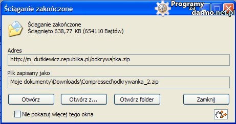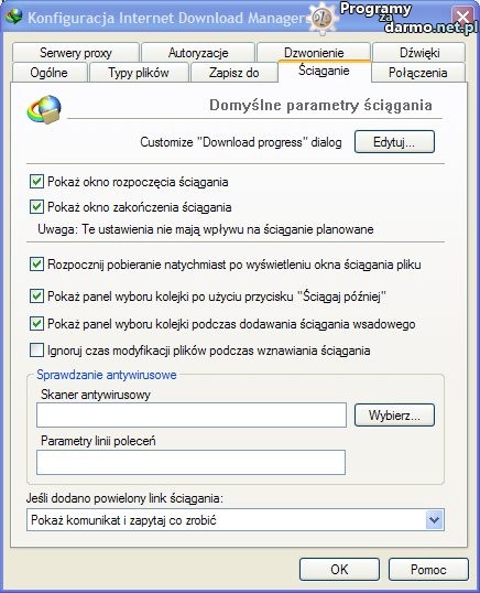 Możesz wyłączyć to okno, zaznaczając pole: „Nie pokazuj ponownie tego okna”. Później można je włączyć lub wyłączyć w menu Ściąganie-> Opcje-> Ściąganie (karta)