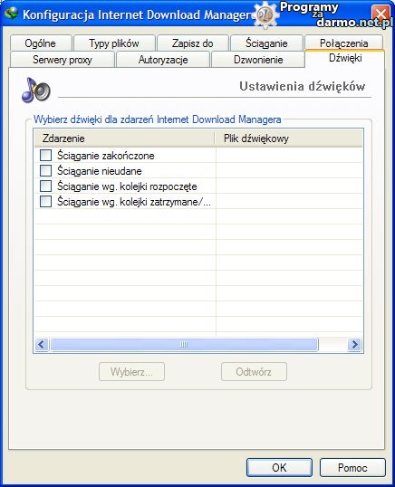 IDM może włączać różne dźwięki do różnych sytuacji pobrania. Na tej karcie można wybrać pliki dźwiękowe i zestaw wydarzeń.