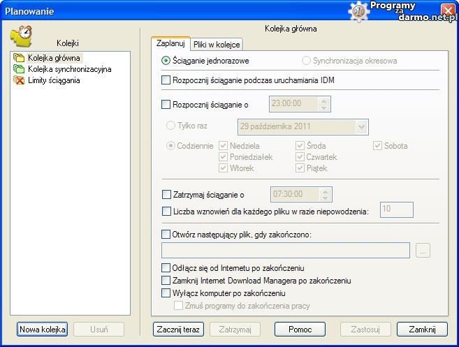- można również zaplanować czas, kiedy rozpocząć kolejkę, jak również czas, aby zatrzymać przetwarzanie kolejki w oknie „Planowanie”
