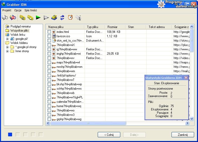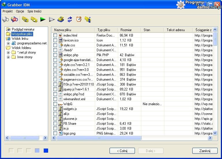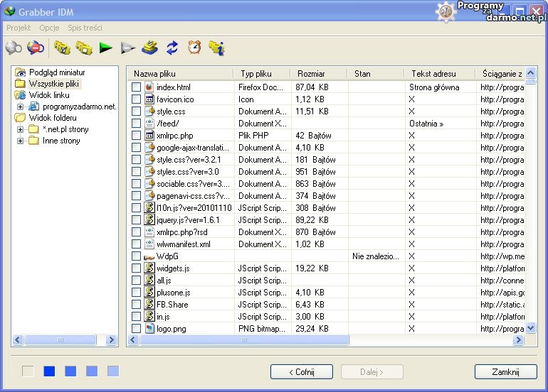 Główne okno grabber zawiera pasek narzędzi, okno w którym wszystkie pliki są wyświetlane i drzewo, które pokazuje strukturę witryny.