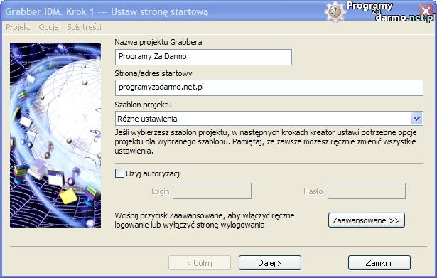 Jeśli witryna wymaga autoryzacji, należy również ustalić login i hasło na ten krok. Niektóre witryny umożliwiają przeglądanie / pobieranie tylko po uwierzytelnieniu. W tym przypadku należy nacisnąć na „Zaawansowane >>”, zaznaczyć opcję „Podaj login i hasło ręcznie” w oknie.