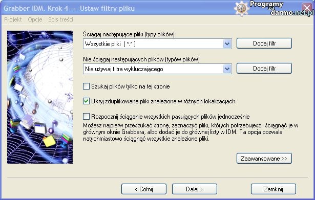 W tym kroku należy ustawić typ pliku, lokalizacji i inne filtry dla pobranych plików.