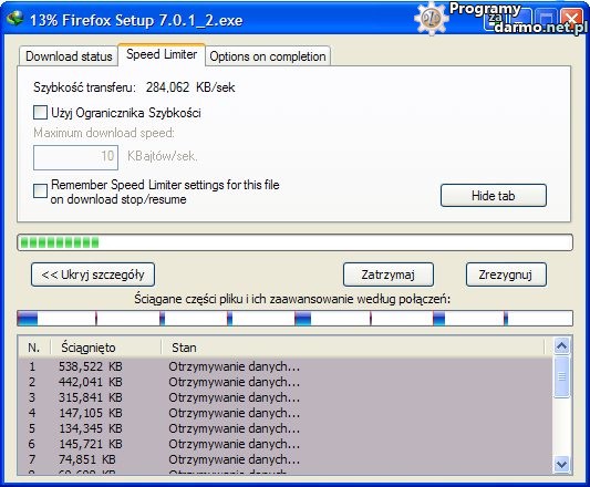 Jeśli chcesz, aby rozpocząć pobieranie natychmiast, naciśnij Rozpocznij ściąganie. Wtedy pojawi się okno pobierania pliku. W oknie dialogowym można uzyskać dodatkową kontrolę nad pobieraniem pliku. Pokazuje również postęp pobierania, średnią prędkość pobierania, szacowany czas do zakończenia, aktualny stan pobierania, czy serwer obsługuje opcje wstrzymywania, itp. Okno dialogowe ma również wykres do wyświetlania postępu pobierania dla każdego segmentu pobranego pliku.