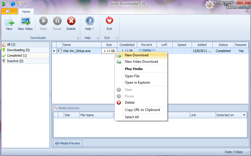 Jordy Downloader to bardzo fajny, bezpłatny menedżer pobierania plików, który jak zapewnia producent programu, pozwala znacząco przyśpieszyć pobieranie danych ( nawet do 500% ) dzięki zastosowaniu tzw.segmentacji ściąganych plików.Program monitoruje na bieżąco schowek systemu Windows, automatycznie wykrywa linki do pobierania, integruje się praktycznie z każdą przeglądarką internetową i automatycznie powiadamia o wszystkich dostępnych plikach multimedialnych (audio i wideo) na odwiedzanej stronie, co pozwala na ich szybkie pobieranie do określonych przez nas wcześniej lokalizacji. Plik jest automatycznie dodawany do tzw.detektora plików multimedialnych.Tworzona jest lista, z której następnie można wybrać pliki do pobrania lub po prostu je podglądnąć. Jordy Downloader automatycznie wykryje połączenie ze schowka. Obsługuje protokoły HTTP, HTTPS, serwery FTP, magazyny online w których są przechowywane dane oraz strumienie audio i wideo.