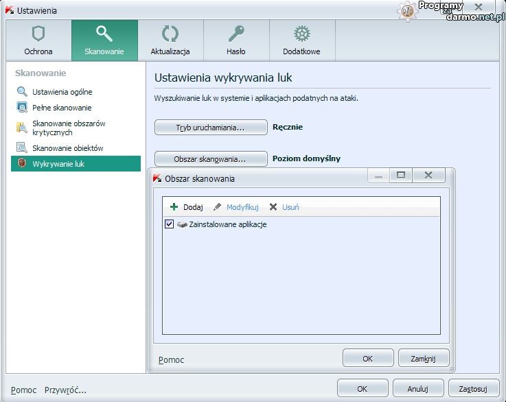 Zagrożenia i wykluczenia – tu możemy określić dodatkowe treści dla ochrony – dodać lub wykluczyć zachowanie programu względem np. innych programów: