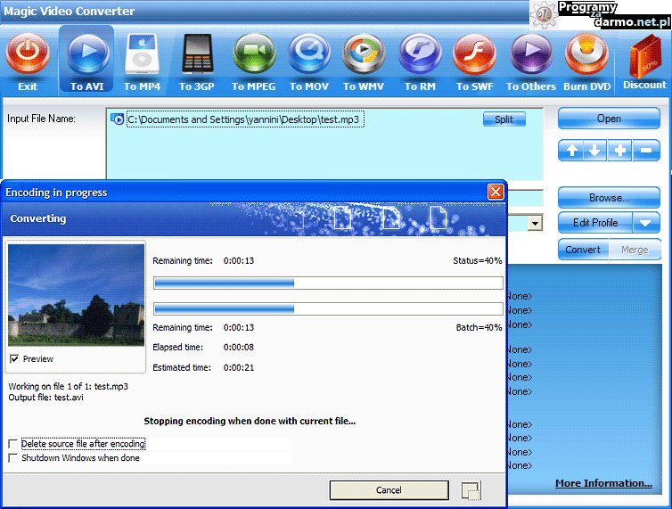 Magic Video Converter to bardzo rozbudowany program do konwersji różnych formatów audio i video. Program obsługuje większość popularnych formatów (AVI, MPEG, MPEG 1, MPEG 2, MPEG 4, VCD, DVD, SVCD, RMVB, RM, WMV, MOV, DIVX i wiele innych).