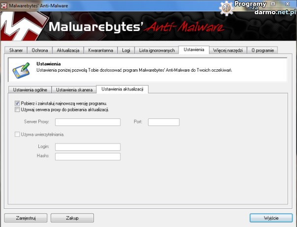 Zakładka „aktualizacje” pozwala wykonać aktualizację oprogramowania oraz bazy danych do najnowszej wersji