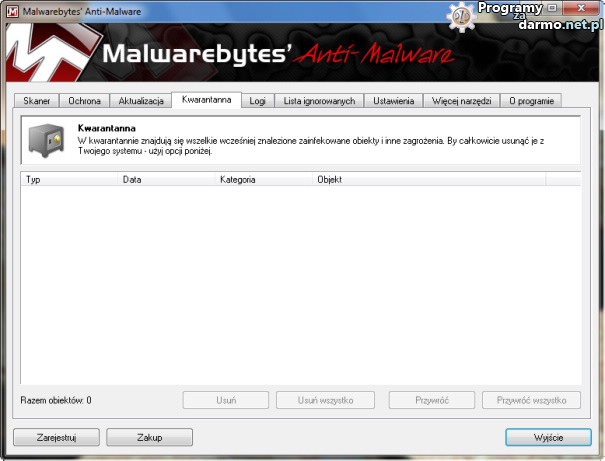 „Kwarantanna” – to miejsce gdzie automatycznie trafiają wszelakie podejrzane i zainfekowane pliki oraz inne zagrożenia wykryte podczas skanowania. Można je usunąć lub … przywrócić – na własną odpowiedzialność 😉