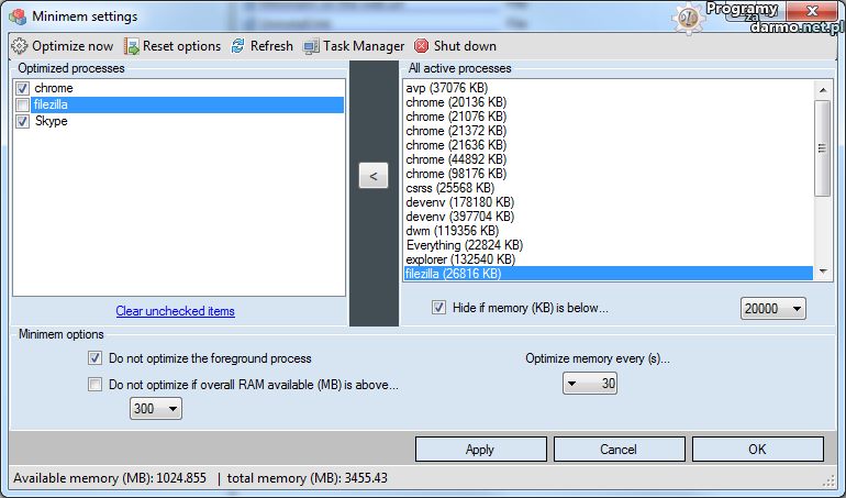 W większości przypadków jest tak że programy zajmują bloki pamięci przez chwilę, ale pozostawiają tą pamięć jako zarezerwowaną.Tutaj do akcji wkracza Minimem który zabiera tylko te wolne bloki pamięci, nie wyrządzając tym aplikacji żadnej szkody.Interfejs programu jest bardzo prosty, mamy do dyspozycji dwa okienka, w jednym wyświetlone są wszystkie uruchomione procesy, a do drugiego przenosimy te, które chcemy aby były optymalizowane przez Minimem.Po jednorazowej konfiguracji, program cały czas działa w tle i optymalizuje zużycie pamięci RAM przez uruchomione procesy.Program jest w języku angielskim.